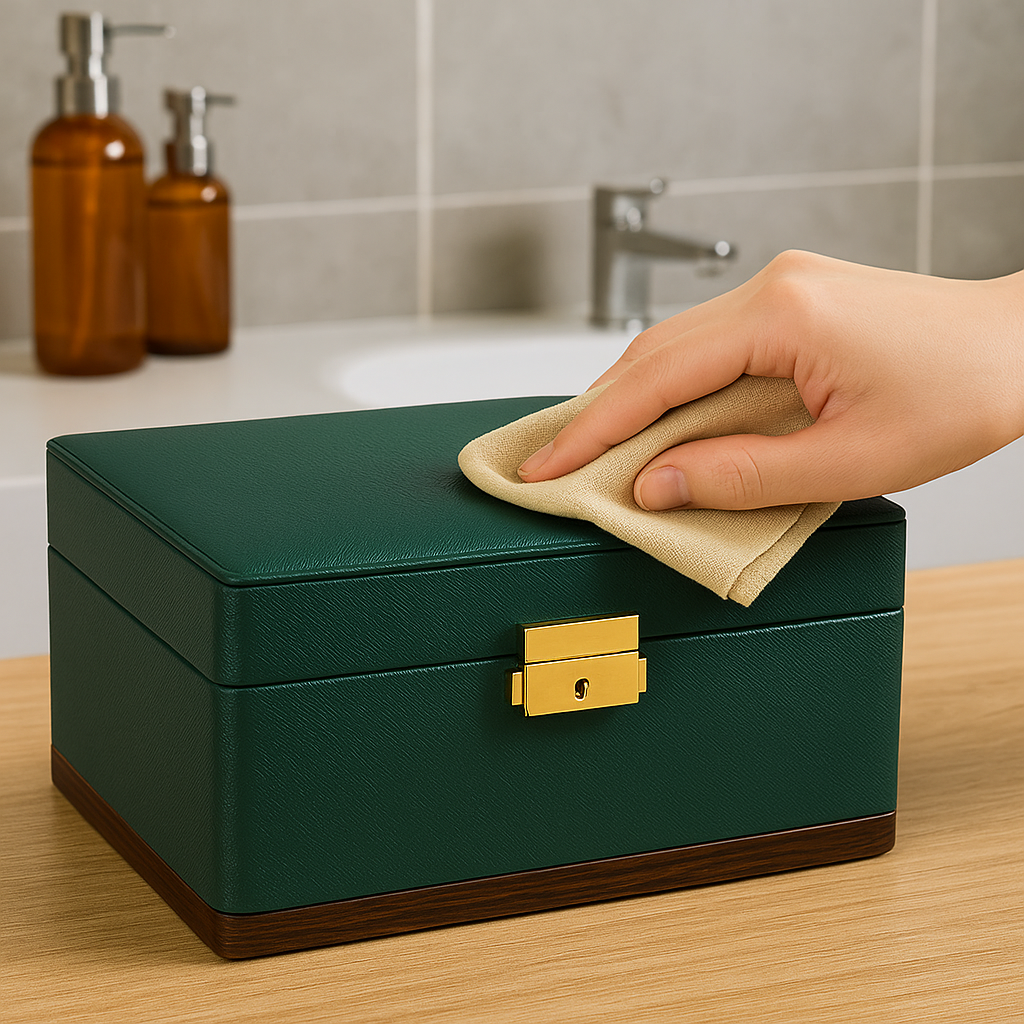 L'esterno in pelle PU o in legno può essere pulito con un panno morbido, mentre l'interno in velluto può essere pulito utilizzando una spazzola morbida o un aspirapolvere a bassa potenza.